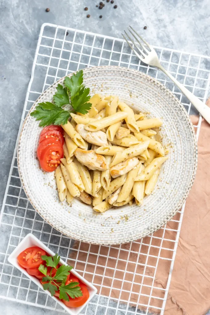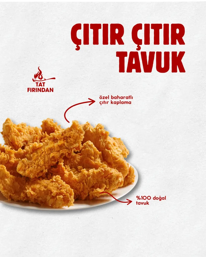 Tavuk Eti, Kıvırcık, Turşu, Ketcap, Mayonez, Patates Kızartaması ile servis edilir.