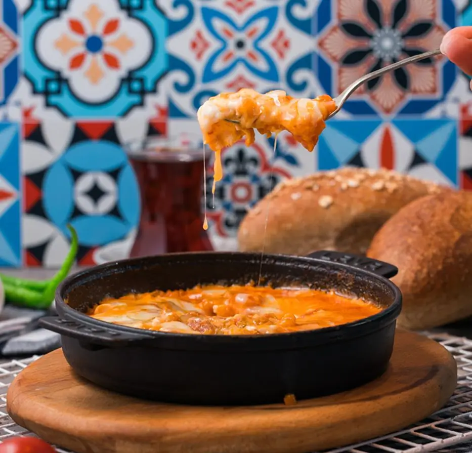Tavada pişirilmiş yumurta ve bol kaşar peyniriyle hazırlanan enfes lezzet.
