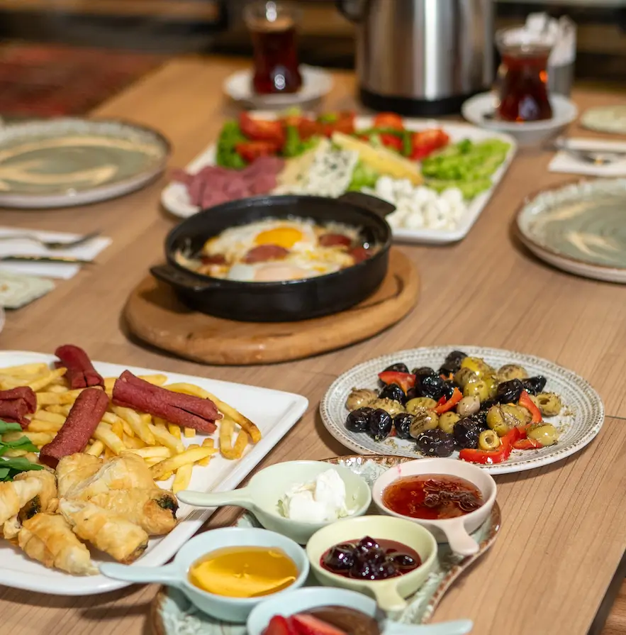 Beyaz peynir, kaşar peynir, topik peynir, burgu peynir, nutella, iki çeşit acuka sos, zeytin çeşitleri, bal, kaymak, jambon, salam, su böreği, sosis, patates tava, ceviz, incir, kuru kayısı ve bir adet demlik çay.