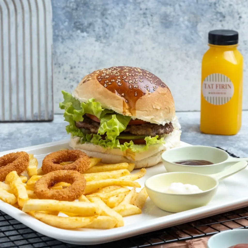 90 gr Dana Burger eti, Kıvırcık, Domates,Turşu,Soğan, Ketcap, Patates Kızartması ile Servis edilir.