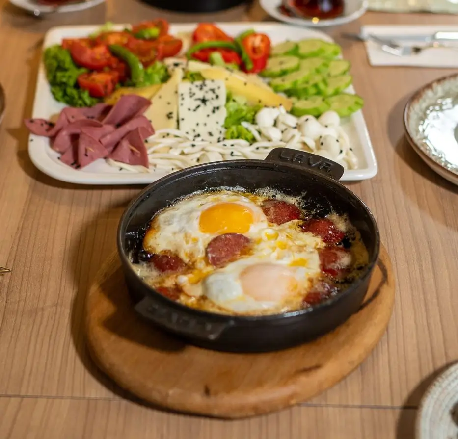 Tavada pişirilmiş yumurta ve dilimlenmiş sucukla hazırlanan lezzetli klasik.